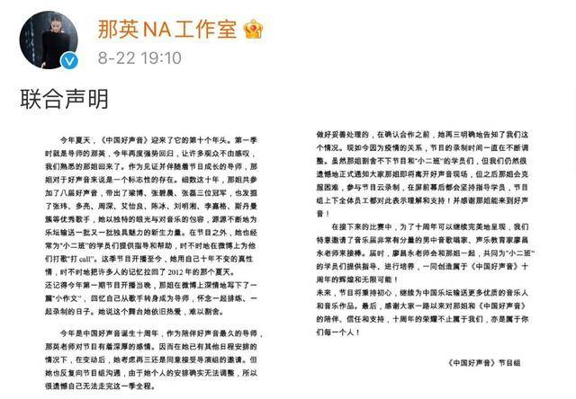 中國好聲音2021 那英. 再比如中国好声音2021中模式大升级后的四位助教导师之一并与那英搭档的张碧晨当年也是那英姐的关门弟子 但是根据网络著名音乐博主灯灯HO HO的爆料在中国好声音2021导师盲选阶段结束以后那英将离开今年的好声音舞台的导师座席. 出版 2021-08-07 0100 更新2021-08-07 0100. 中國好聲音那英改雲錄製 2021-08-24 043221 娛樂 中國知名音樂節目中國好聲音一路走來已經10年雙方近日發布聯合聲明表示那英對於節目來說是一個標誌性的存在一直以來帶出3位冠軍與許多優秀歌手為樂壇源源不絕地注入許多新生力量在節目外也不時指導學員打歌.